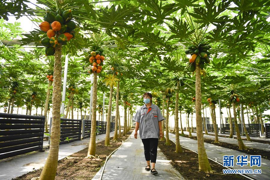 在吉林省永吉縣萬昌鎮(zhèn)宇豐紅果木瓜產(chǎn)業(yè)園,工作人員在大棚內(nèi)管護木瓜(8月12日攝)。新華社記者 許暢 攝