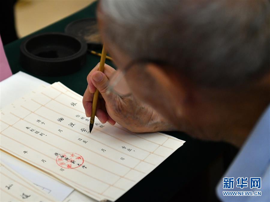 8月13日,陜西師范大學(xué)退休教師郭祖儀(右)書寫錄取通知書。當日,陜西師范大學(xué)2020年手寫錄取通知書正式開筆。該校自2007年起采用毛筆書寫錄取通知書的方式,為新生傳遞佳音。今年,學(xué)校十余位退休教師、在職教師、校友代表等書法愛好者將為約4500名新錄取的本科生送上帶著墨香的大學(xué)錄取通知書。新華社記者張博文攝