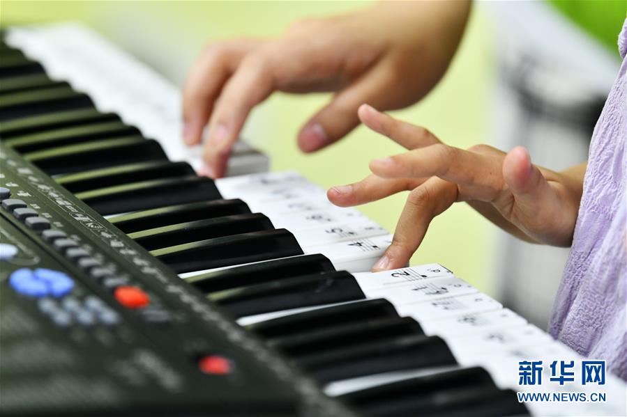 8月13日,在貴州省思南縣雙塘街道麗景社區(qū)易地扶貧搬遷安置點,志愿者在指導(dǎo)孩子學彈電子琴。新華社記者楊文斌攝