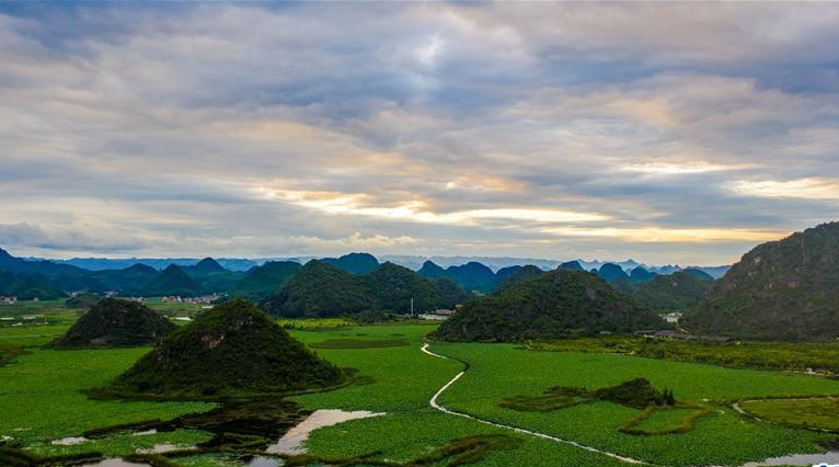 近日,云南省文山壯族苗族自治州丘北縣普者黑國家濕地公園山青水秀,風景優(yōu)美,吸引眾多游人前來觀光。