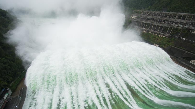 7月8日,新安江水庫開啟9孔泄洪,新安江電廠工作人員在壩區(qū)巡視。
