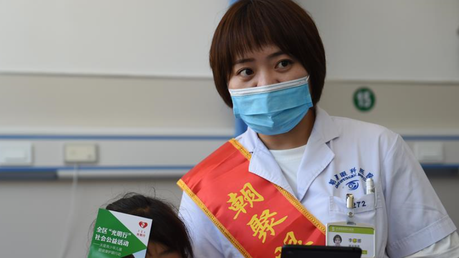 6月15日,在阿魯科爾沁旗人民醫(yī)院,醫(yī)生在流動手術車上準備為白內障患者做免費復明手術。