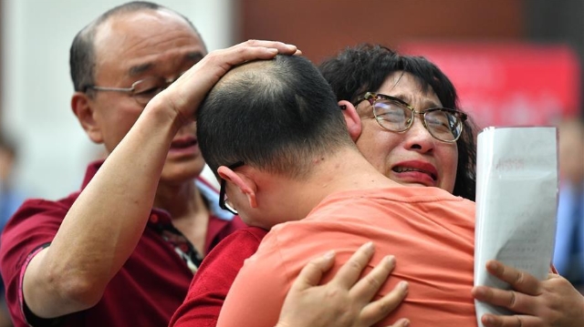 5月18日,李靜芝、毛振平(左)與失散32年的兒子團(tuán)聚。