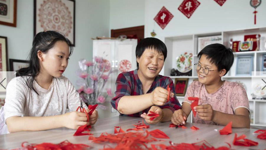 8月2日,寧夏吳忠市利通區(qū)永昌社區(qū)手工培育坊內(nèi),自治區(qū)級剪紙非遺傳承人趙文花(中)在教小學(xué)生剪紙。