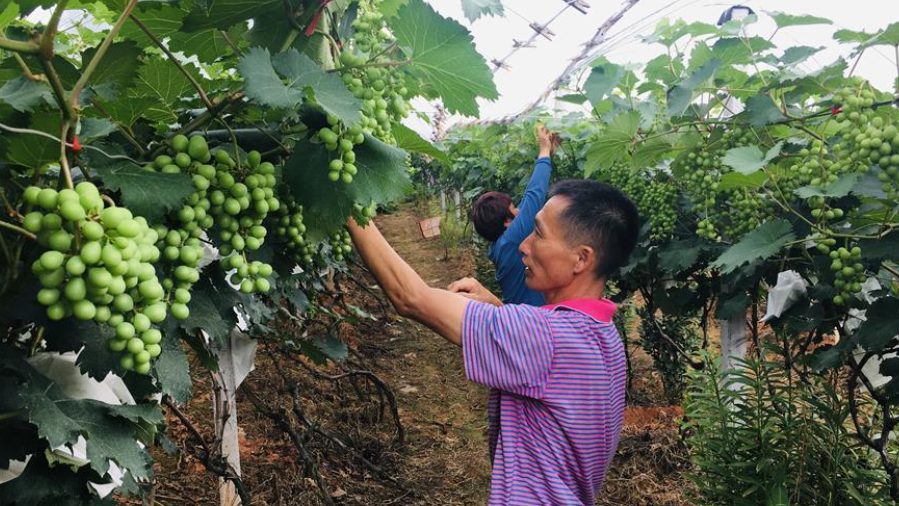 7月2日,湖南省宜章縣五嶺鎮(zhèn)沿江村村民肖國(guó)林夫婦在葡萄園內(nèi)勞作。