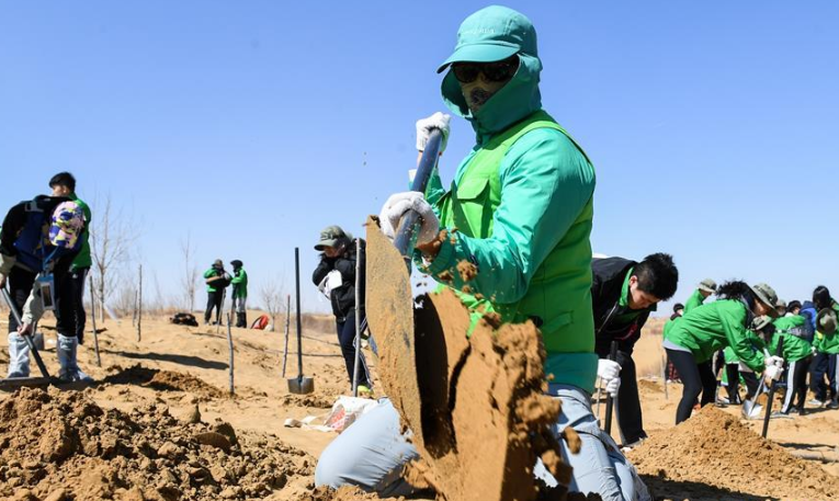 當日,200余名中韓兩國青年志愿者來到內蒙古自治區(qū)達拉特旗庫布其沙漠種樹。