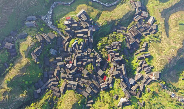 這是3月29日無人機拍攝的廣西融水苗族自治縣桿洞鄉(xiāng)黨鳩村的田園春色。