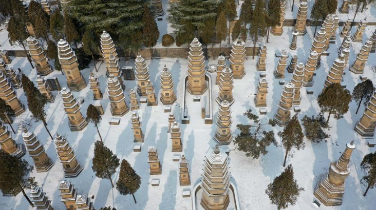 1月10日無人機(jī)拍攝的少林寺一景。當(dāng)日,雪后初霽,河南登封少林寺分外秀美。