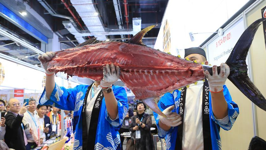 11月7日,來自日本長崎魚市株式會社的專業(yè)切魚師傅現(xiàn)場解體一條70公斤的藍鰭金槍魚,吸引大量參觀者觀看、品嘗。