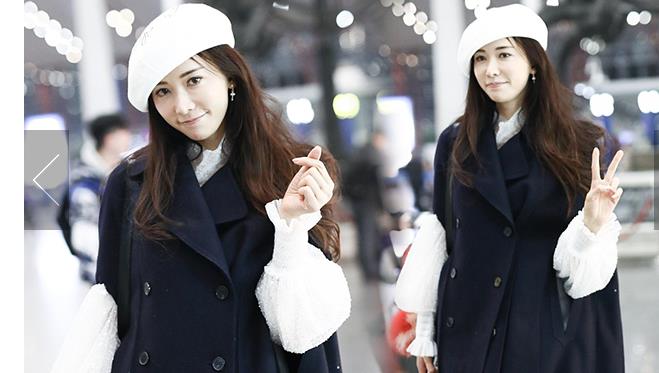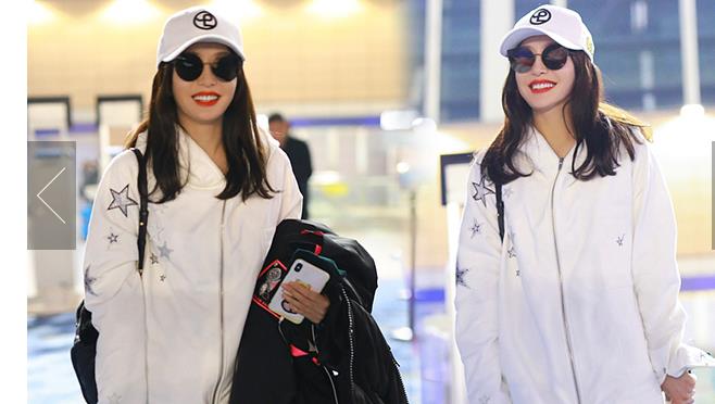 11月29日,上海,秦嵐現(xiàn)身機(jī)場。她戴白色鴨舌帽,穿白色星星圖案外套配微喇牛仔褲,架黑超涂紅唇笑靨如花。