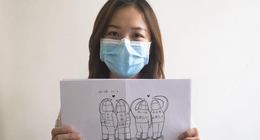 3月13日,黎婧展示自己在疫情期間創(chuàng)作的插畫。他們由專車運(yùn)送至所屬社區(qū)附近的集散點(diǎn)后,在社區(qū)工作人員的陪同下回家。