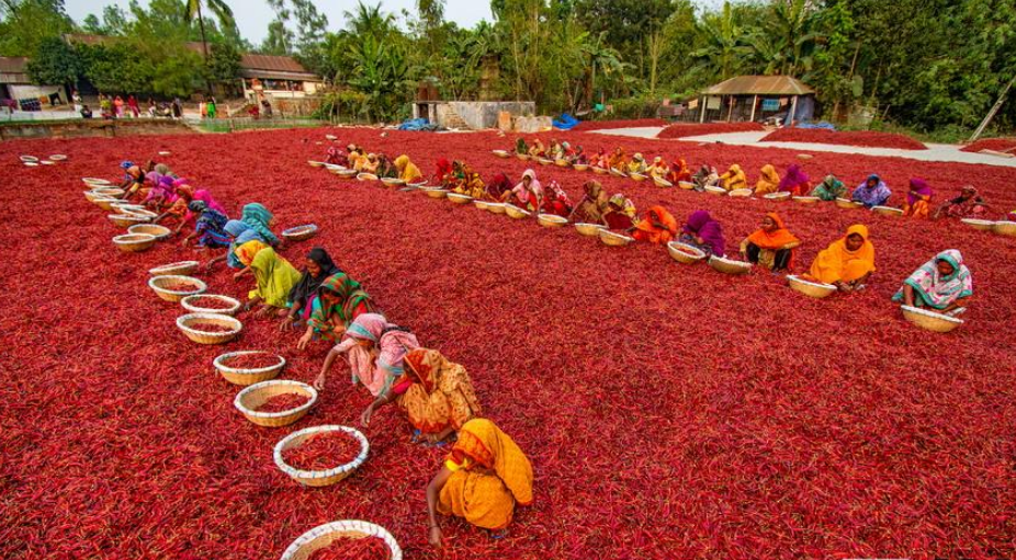 航拍孟加拉國工人分揀辣椒 滿眼火紅大地如鋪上地毯