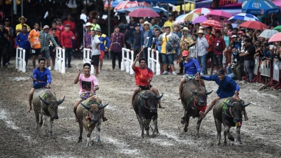 當?shù)貢r間2019年10月12日,泰國春武里舉行一年一度的水牛賽跑,選手騎??癖肌?/p>