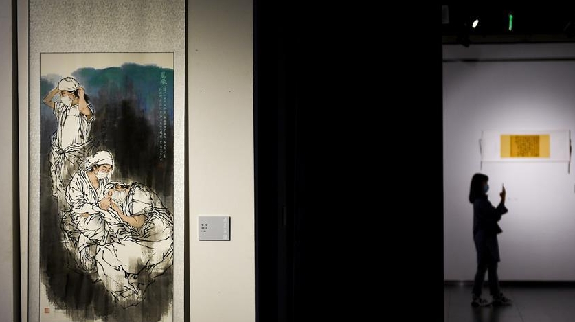 7月11日,觀眾在吉林省抗疫主題美術(shù)·攝影作品展上參觀。展覽共展出抗擊新冠肺炎疫情主題書法、國畫、油畫、攝影等作品367件(組)。
