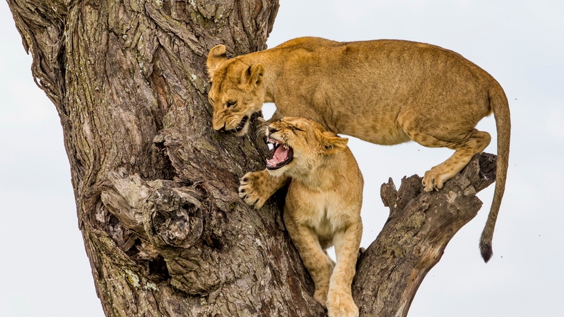 攝影師抓拍獅子上樹畫面 為爭奪位置憤怒咆哮互相攻擊
