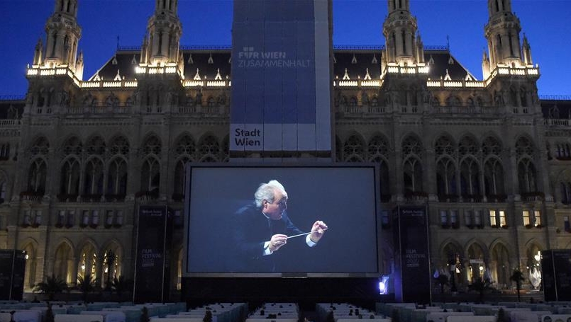7月4日,觀眾們在奧地利首都維也納市政廳廣場內(nèi)場一個個獨立小區(qū)域內(nèi)觀看維也納電影節(jié)開幕電影——貝多芬的歌劇《菲岱利奧》。