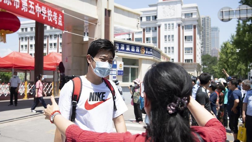 7月7日,在山西省太原市第五中學(xué)校考點,結(jié)束首場科目考試的考生走出考場。