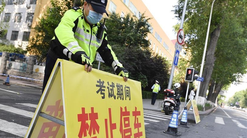 7月7日,在吉林省長春市的東北師范大學(xué)附屬中學(xué)考點外,執(zhí)勤交警在道路上架設(shè)提示牌。