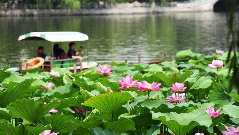 近日,山東濟(jì)南大明湖的荷花陸續(xù)綻放,吸引游客前來觀賞。