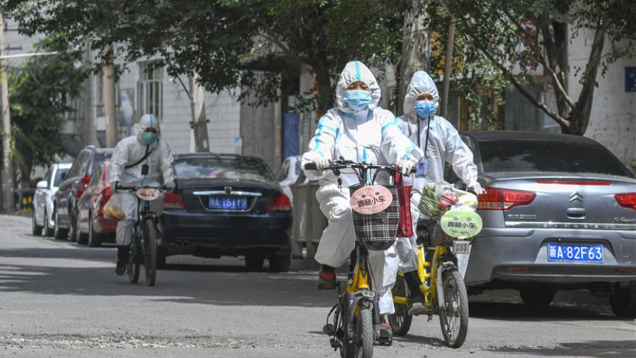 8月3日,在烏魯木齊天山區(qū)西河壩前街社區(qū),社區(qū)工作人員準(zhǔn)備騎上”跑腿小車“為居民送去生活物品。
