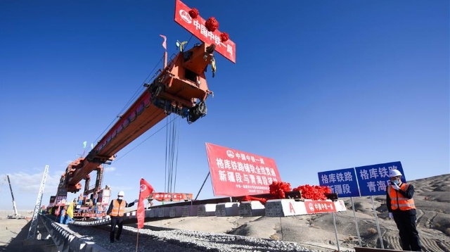 中鐵一局的施工人員在格庫鐵路新疆段鋪設最后一組軌排。