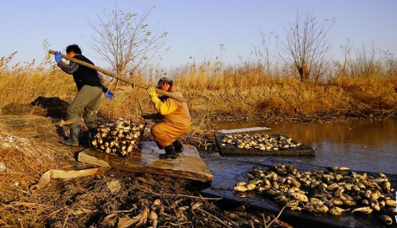 初冬時(shí)節(jié),河北省唐山市曹妃甸蓮藕豐收,工人們?cè)诮Y(jié)冰之前忙著采收蓮藕。