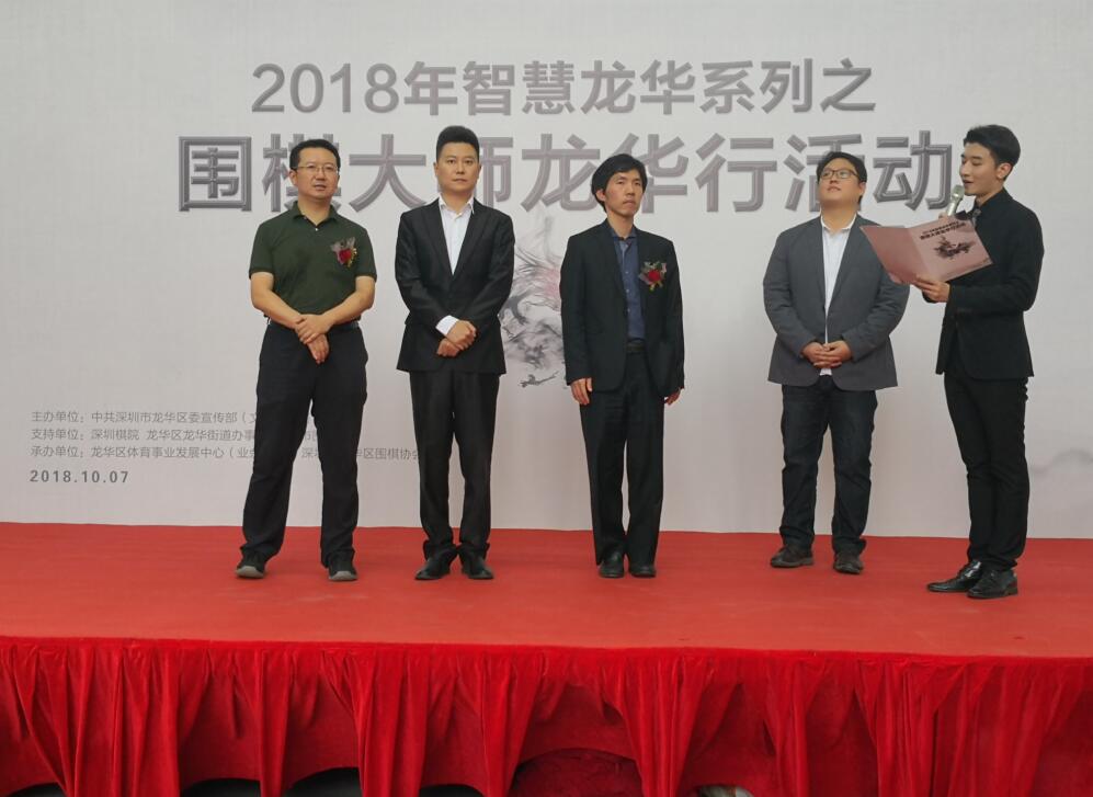 開幕式上,龍華區(qū)委副書記苗寧禮,龍華區(qū)委常委、宣傳部長(zhǎng)黃啟鍵及區(qū)文化體育局相關(guān)負(fù)責(zé)人等在百忙中前來為“智慧龍華”捧場(chǎng)加油?;顒?dòng)在輕松熱鬧的歌舞中拉開帷幕,文化體育局負(fù)責(zé)人在致辭中對(duì)諸位圍棋大師的到來表示熱烈的歡迎,對(duì)活動(dòng)擴(kuò)大中華圍棋文化的傳播,推動(dòng)龍華區(qū)圍棋的發(fā)展給予了充分的肯定。隨后,黃啟健常委代表龍華區(qū)聘請(qǐng)李昌鎬大師擔(dān)任龍華區(qū)圍棋發(fā)展的名譽(yù)顧問并頒發(fā)了證書,李昌鎬則回贈(zèng)了簽名棋盤。緊接著,孔杰老師也給參加活動(dòng)的小棋手贈(zèng)予了簽名棋盤。在廣東圍棋總冠軍佟云老師簡(jiǎn)要介紹李昌鎬、孔杰的精采圍棋經(jīng)歷之后,活動(dòng)主持人還現(xiàn)場(chǎng)采訪了李昌鎬、孔杰,就兩人圍棋從業(yè)過程中的難記經(jīng)歷、精采賽事以及對(duì)人工智能圍的展望等進(jìn)行了提問,兩位大師的回答坦率、誠(chéng)懇,贏得了現(xiàn)場(chǎng)觀眾的陣陣掌聲。活動(dòng)的高潮是李昌鎬、孔杰、車澤武、張亞博四位老師與龍華區(qū)的圍棋愛好者進(jìn)行多面打的活動(dòng),梁偉棠九段和徐瑩老師還進(jìn)行掛盤講解。
