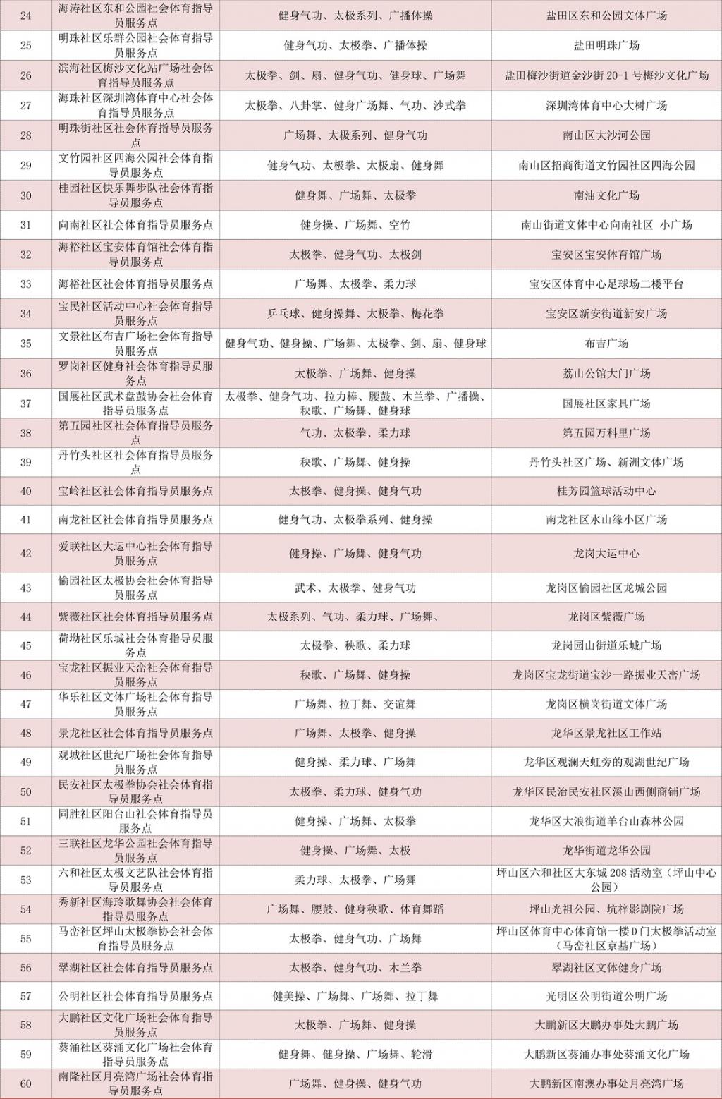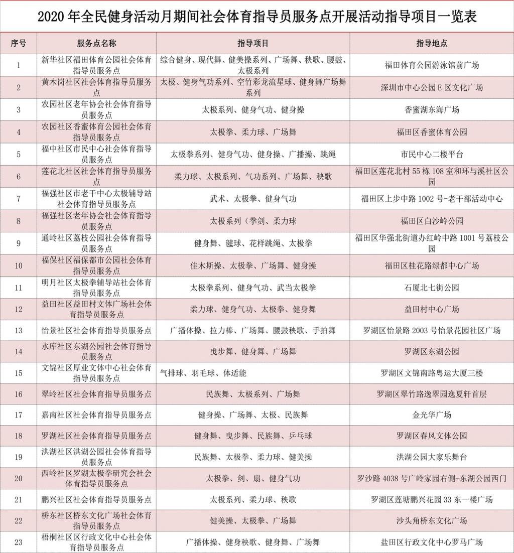 2020深圳全民健身活動月社會體育指導員服務點表: