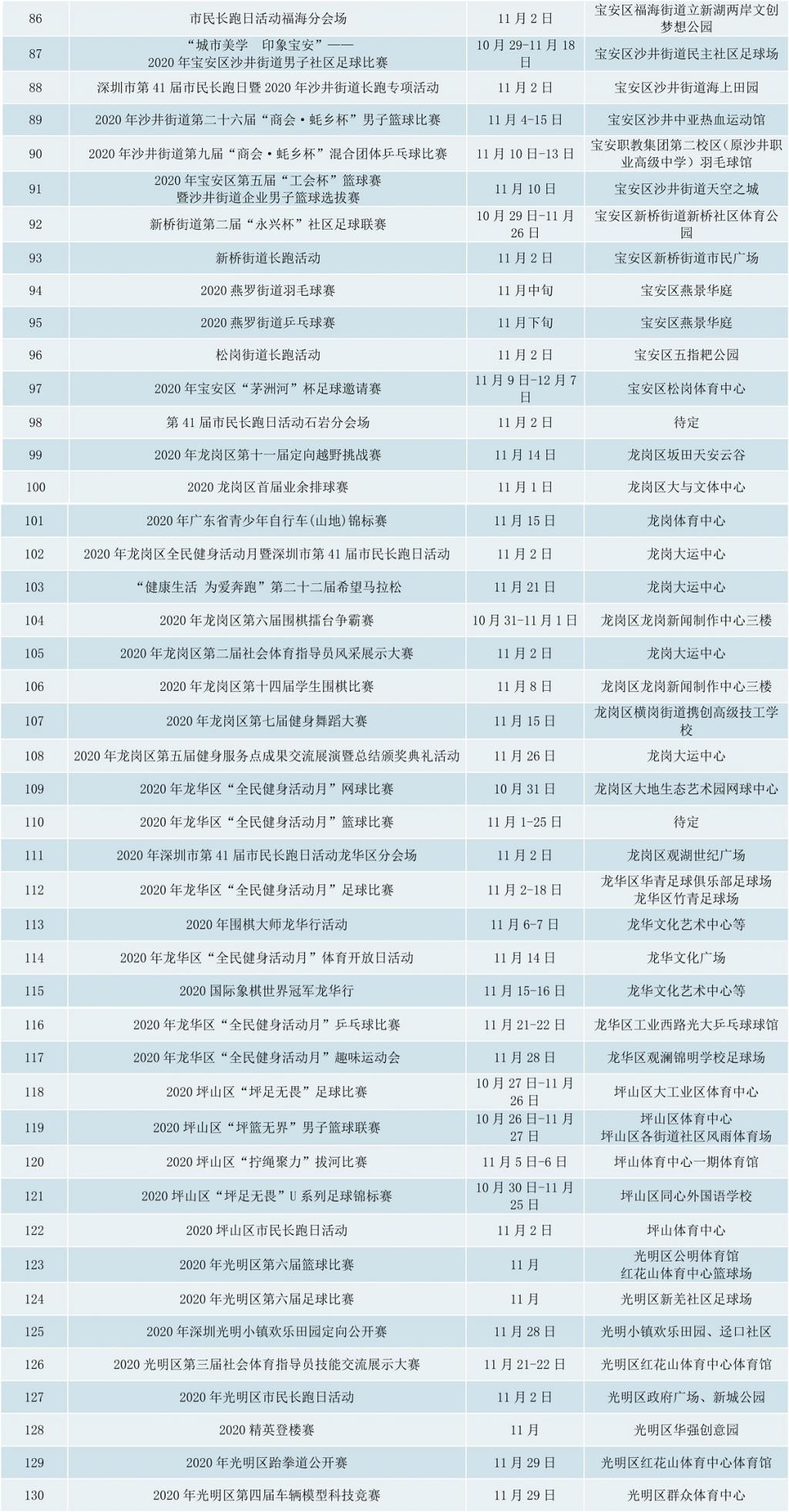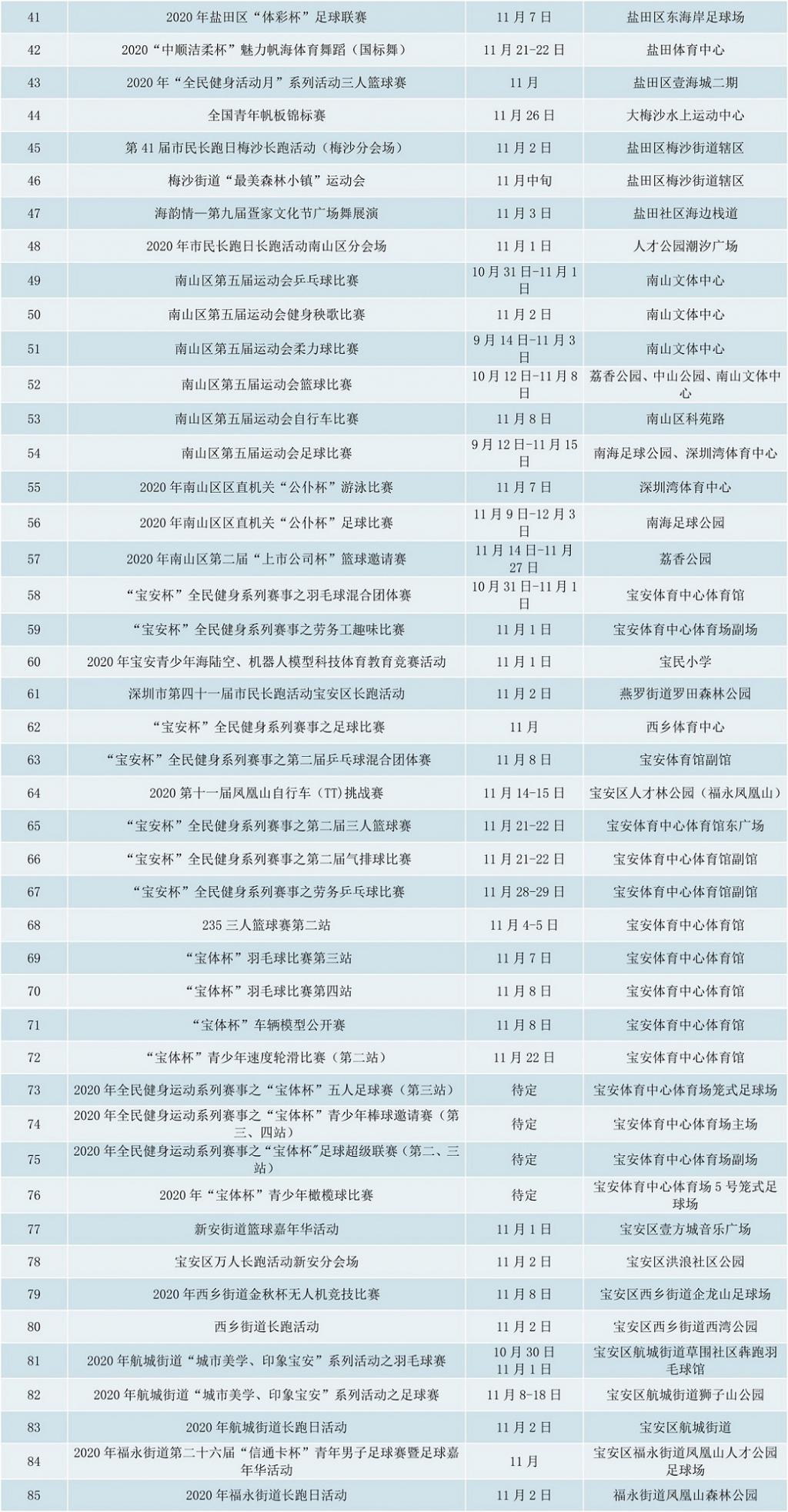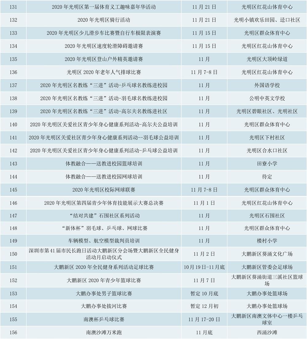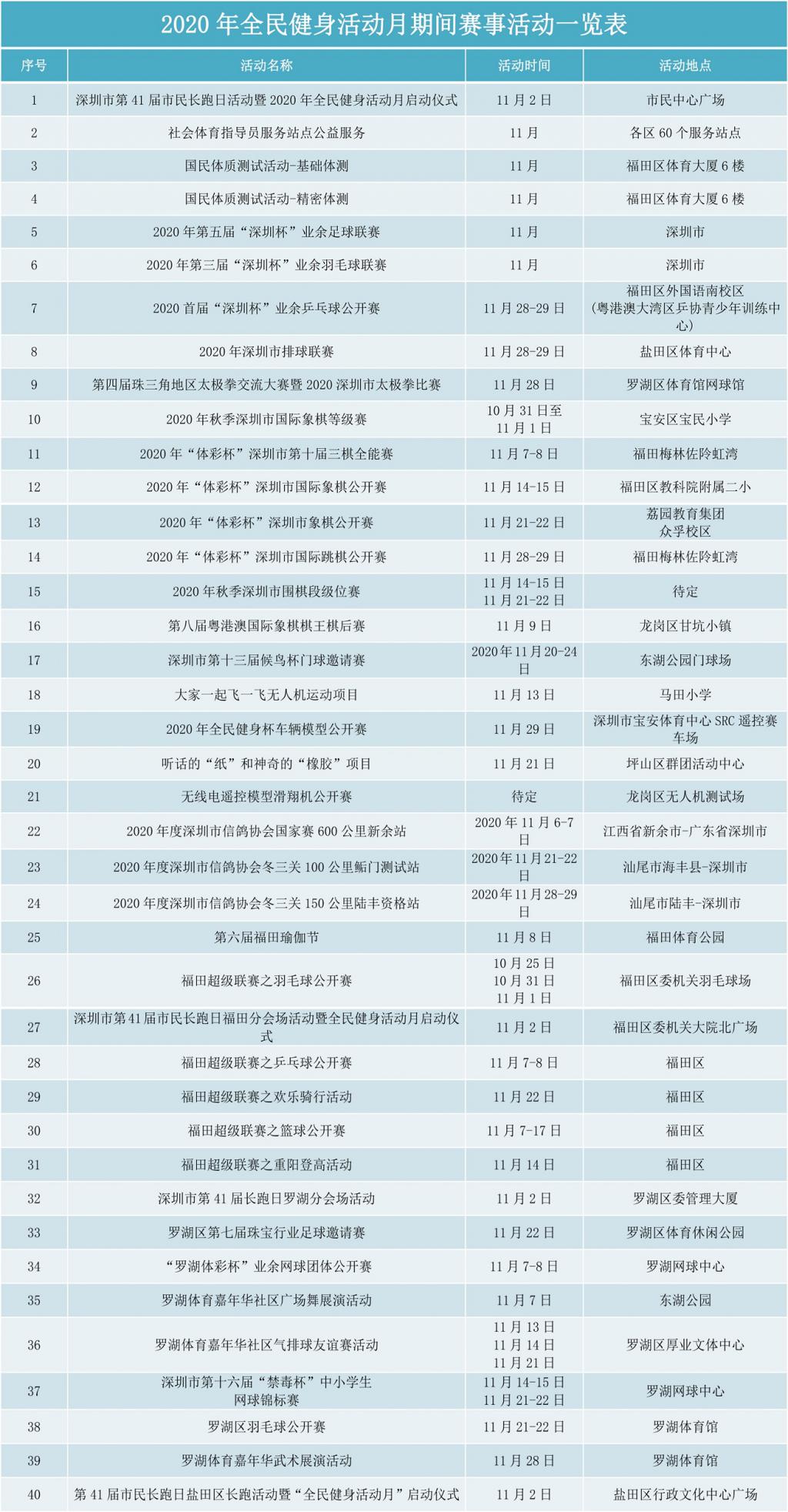 附2020年深圳全民健身活動月期間賽事活動表: