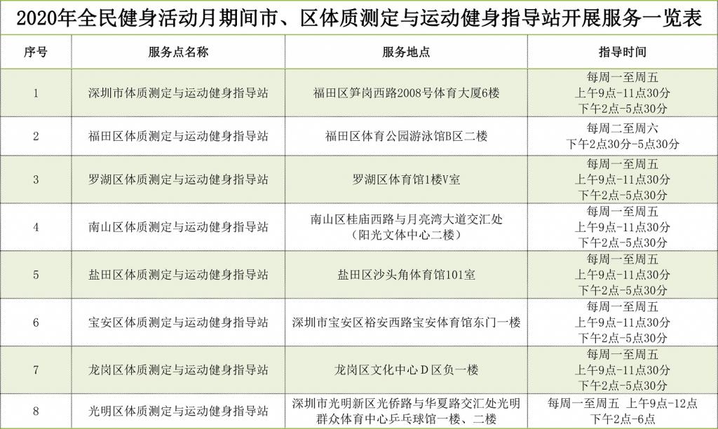 2020年深圳全民健身活動月期間體質測定服務表: