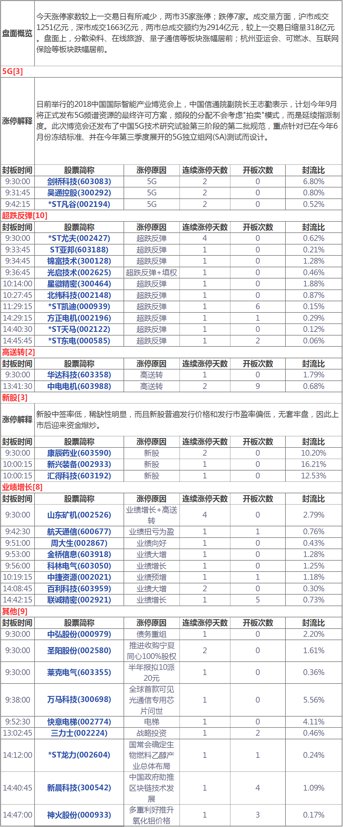 今天漲停家數(shù)較上一交易日有所減少,兩市35家漲停;跌停7家。成交量方面,滬市成交1251億元,深市成交1663億元,兩市總成交額約為2914億元,較上一交易日縮量318億元。盤面上,分散染料、在線旅游、量子通信等板塊漲幅居前;杭州亞運(yùn)會、可燃冰、互聯(lián)網(wǎng)保險(xiǎn)等板塊跌幅居前。