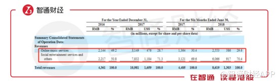 可以看到,2017年上半年,公司在線音樂服務(wù)與以音樂為核心的社交娛樂服務(wù)分別占到總收入的28.7%和71.3%,而在2018年上半年,這兩個數(shù)值為29.6%和70.4%。也就是說,社交娛樂服務(wù)為騰訊音樂的“核心業(yè)務(wù)”。