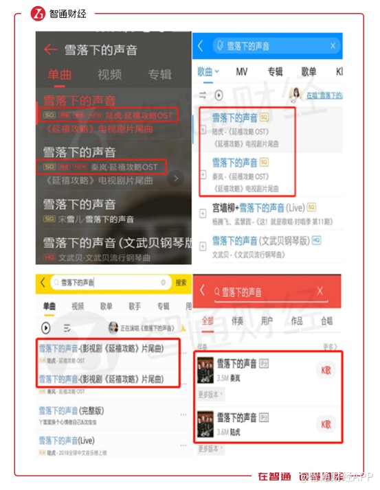 以此前熱播劇《延禧攻略》的片尾曲《雪落下的聲音》為例。這首歌的版權(quán)由QQ音樂獨家擁有,并在APP中擁有“獨家”的標(biāo)識。但實際上,該歌曲在酷狗音樂、酷我音樂和全民K歌上同樣可以播放,可以說騰訊音樂版權(quán)在公司旗下4個產(chǎn)品是通用的。