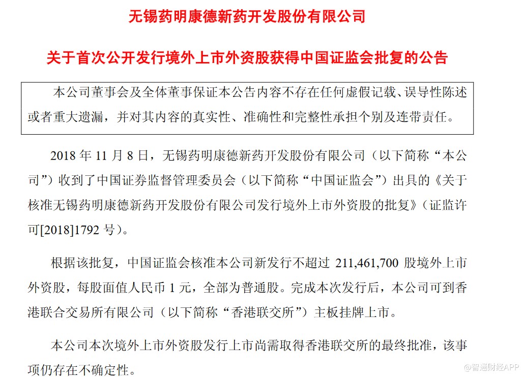 根據(jù)該批復(fù),中國證監(jiān)會核準(zhǔn)藥明康德新發(fā)行不超過2.11億股境外上市外資股,每股面值人民幣1元,全部為普通股。完成本次發(fā)行后,藥明康德可到香港聯(lián)交所主板掛牌上市。