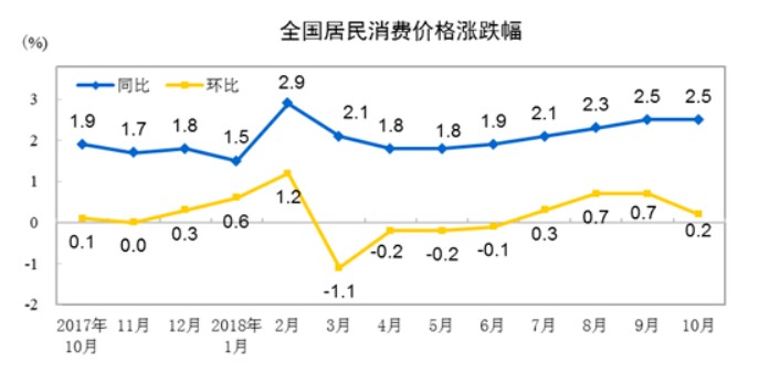 智通財經(jīng)APP獲悉,11月9日,國家統(tǒng)計局發(fā)布10月份CPI數(shù)據(jù)和PPI數(shù)據(jù)。2018年10月份,全國居民消費價格同比上漲2.5%,預期2.5%,前值2.5%。其中,城市上漲2.5%,農(nóng)村上漲2.6%;食品價格上漲3.3%,非食品價格上漲2.4%;消費品價格上漲2.8%,服務價格上漲2.1%。1-10月平均,全國居民消費價格比去年同期上漲2.1%。