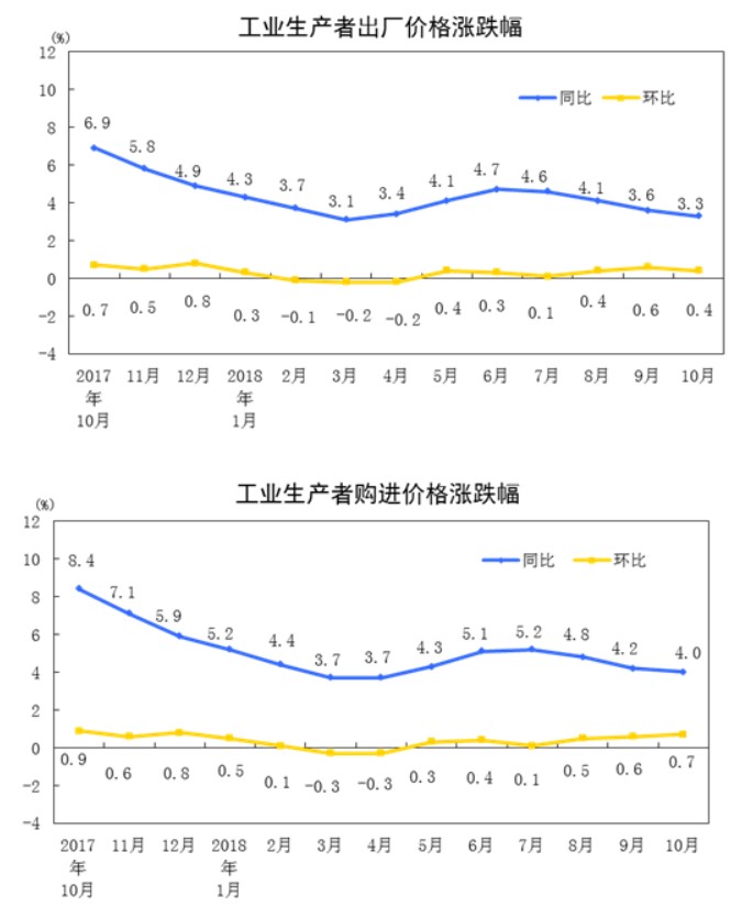 2018年10月份,全國工業(yè)生產(chǎn)者出廠價格同比上漲3.3%,預期3.3%,前值3.6%。環(huán)比上漲0.4%,前值0.6%。工業(yè)生產(chǎn)者購進價格同比上漲4.0%,環(huán)比上漲0.7%。1-10月平均,工業(yè)生產(chǎn)者出廠價格比去年同期上漲3.9%,工業(yè)生產(chǎn)者購進價格上漲4.5%。