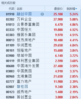 智通財經(jīng)APP獲悉,多地按揭利率出現(xiàn)松動放款加速,內(nèi)房股集體上揚,截至15時43分,融創(chuàng)中國(01918)漲5.24%,報價25.1港元,萬科企業(yè)(02202)漲5.08%,中國恒大(03333)漲4.52%,華潤置業(yè)(01109)漲4.04%,中國奧園(03883)漲3.37%,碧桂園(02007)漲2.3%。
