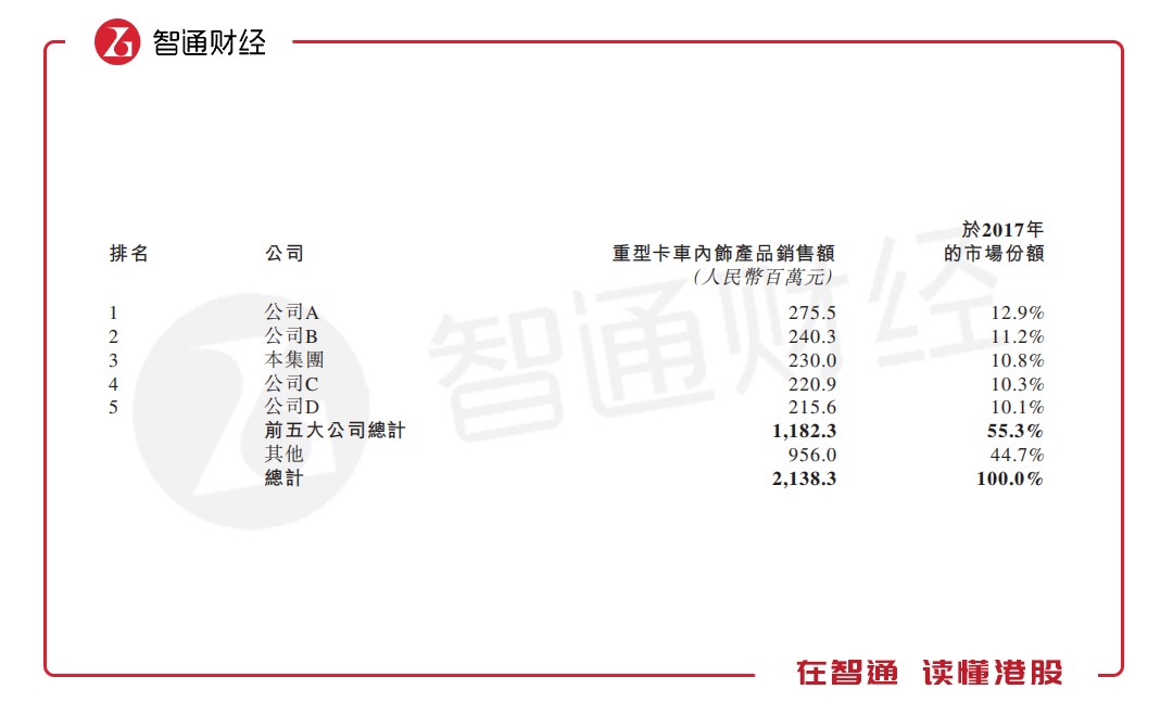根據(jù)弗若斯特沙利文報(bào)告,按重型卡車內(nèi)飾產(chǎn)品的銷售額計(jì),公司是中國西北最大的重型卡車內(nèi)飾產(chǎn)品制造商(2017年市場(chǎng)份額達(dá)62.7%)及中國的第三大制造商(2017年市場(chǎng)份額達(dá)10.8%);按汽車內(nèi)飾產(chǎn)品的銷售額計(jì),公司是中國西北第二大汽車內(nèi)飾產(chǎn)品制造商(2017年市場(chǎng)份額達(dá)15.6%)及中國第十四大制造商(2017年市場(chǎng)份額達(dá)0.4%)。