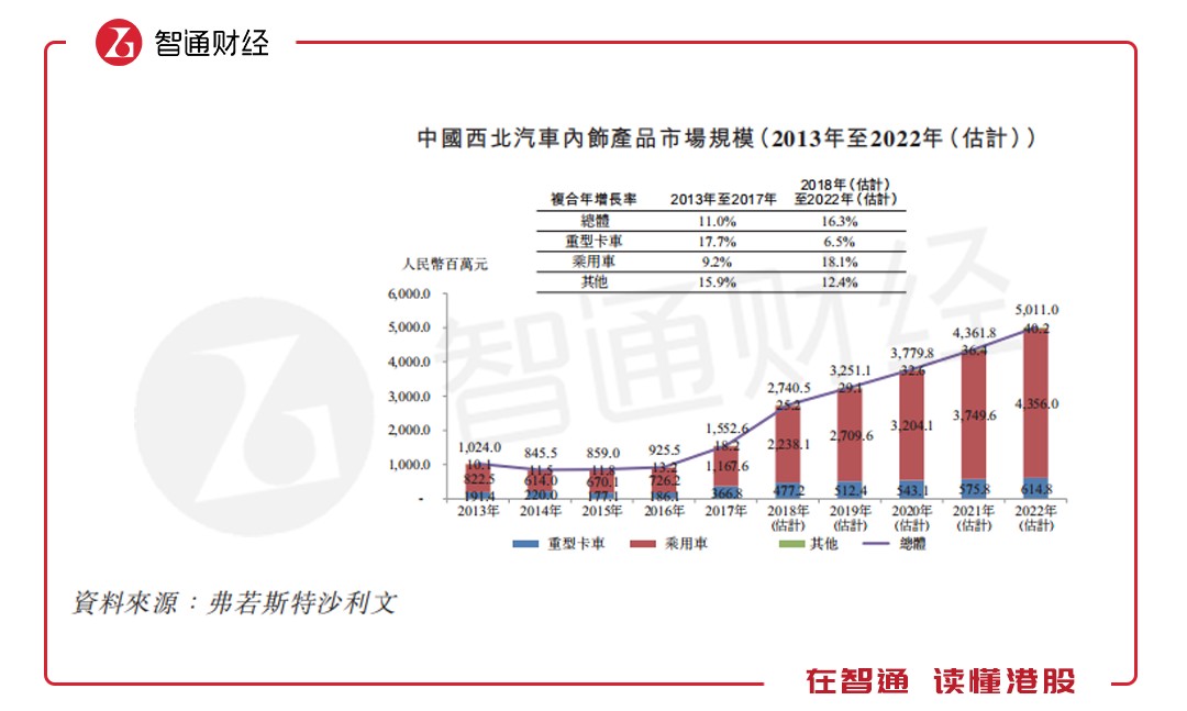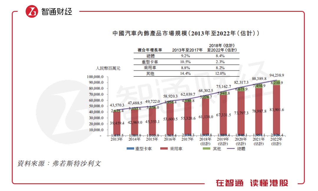 智通財(cái)經(jīng)APP進(jìn)一步查閱天瑞招股說明書發(fā)現(xiàn),從行業(yè)來看中國汽車內(nèi)飾產(chǎn)品市場(chǎng)的總值由2013年的435.7億元增至2017年的620.4億元,復(fù)合年增長(zhǎng)率為9.2%。估計(jì)市場(chǎng)規(guī)模將于2022年達(dá)到942.39億元,2018年至2022年期間的復(fù)合年增長(zhǎng)率為8.4%。