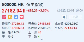 智通財(cái)經(jīng)APP獲悉,中美貿(mào)易摩擦憂(yōu)慮減退,市場(chǎng)情緒得到提振,恒指早盤(pán)高開(kāi)2.56%,報(bào)27185.66點(diǎn)。全日維持高位震蕩,截至收盤(pán),恒生指數(shù)漲675.29點(diǎn)或2.55%,報(bào)27182.04點(diǎn),全日成交額達(dá)1296.25億。國(guó)企指數(shù)漲2.45%,報(bào)10882.16點(diǎn),紅籌指數(shù)漲1.21%,報(bào)4391.2點(diǎn)。