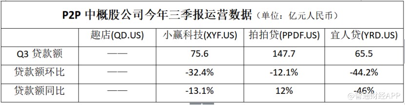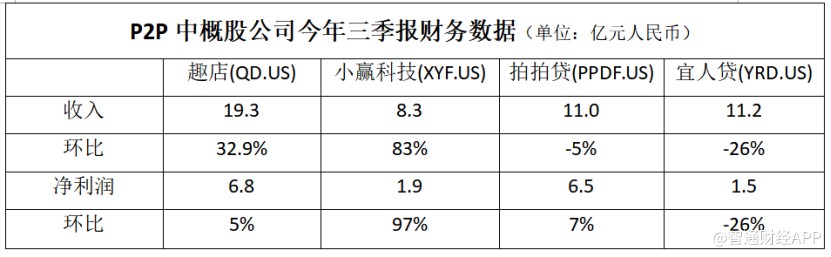 智通財經APP觀察到,在披露三季報的P2P中概股公司中,趣店(QD.US)收入達19.3億元(人民幣,單位下同),環(huán)比增長32.9%,同期凈利潤為6.8億元,環(huán)比增長5%;小贏科技(XYF.US)收入為8.3億元,環(huán)比增加83%,凈利潤為1.9億元,環(huán)比增長97%;拍拍貸(PPDF.US)收入為11億元,環(huán)比下跌5%,凈利潤為6.5億元,環(huán)比增長7%;宜人貸(YRD.US)收入為11.2億元,環(huán)比下跌26%,凈利潤為1.5億元,環(huán)比下跌26%。