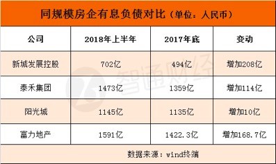 富力地產財報數(shù)據(jù)顯示,2015年至2018年三季度,富力地產的負債總額分別達1345億元、1795億元、2332億元及2863億元。其中,有息負債已經高達1600逾億,對比同規(guī)模的房企,這一數(shù)據(jù)居于同水平房企高位。