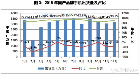 2018年全年,智能手機(jī)出貨量3.90億部,同比下降15.5%,占同期手機(jī)出貨量的94.1%,其中Android手機(jī)在智能手機(jī)中占比89.3%。
