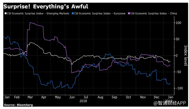 兩位分析師表示,歐洲和新興市場(chǎng)的經(jīng)濟(jì)驚喜指數(shù)均陷入負(fù)值區(qū)間。而標(biāo)普500指數(shù)成份股公司約有三分之一的營收來自海外,海外市場(chǎng)的進(jìn)一步疲軟可能最終會(huì)令美國國內(nèi)的增長前景變得黯淡。此外,美國國內(nèi)的經(jīng)濟(jì)增長前景在一定程度上也已經(jīng)因美國政府部分關(guān)門而減弱。