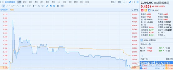 智通財(cái)經(jīng)APP獲悉,1月10日停牌的前進(jìn)控股集團(tuán)(01499)于24日復(fù)牌,股市反響劇烈,開盤十分鐘曾一度暴漲74.56%,不過(guò)隨后不斷滑落,截止16時(shí)45分,報(bào)港元0.425元(下同),較停牌日收盤價(jià)0.39元僅有9%的增幅。