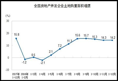 2018年房地產(chǎn)開發(fā)企業(yè)土地購置面積為29142萬平方米,比上年增長14.2%,比上年回落1.6個百分點(diǎn);土地成交價款16102億元,增長18.0%,比上年回落31.4個百分點(diǎn)。