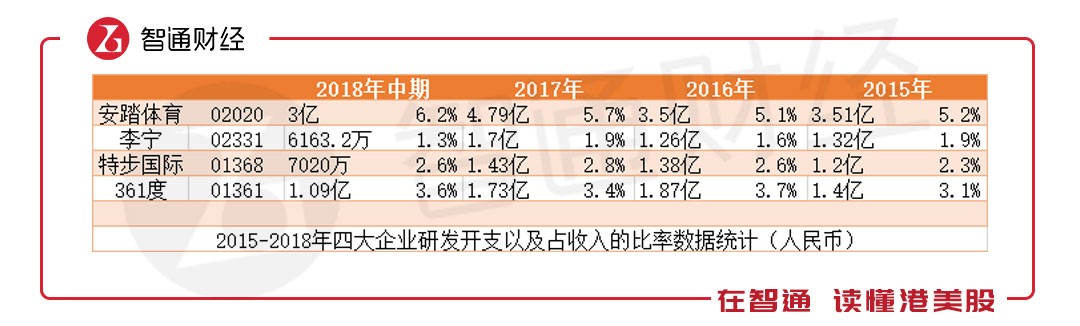 從2015-2018年中期,李寧的研發(fā)支出一直是國(guó)內(nèi)四大體育用品企業(yè)中最低的。以2018年上半年為例,李寧的研發(fā)支出為6163.2萬元,占當(dāng)期收入的比率僅為1.3%,而安踏研發(fā)支出高至3億元,就連特步、361的研發(fā)支出比率都高于李寧。