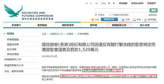 香港證監(jiān)會(huì)調(diào)查發(fā)現(xiàn),國信證券在2014年11月至2015年12月期間曾為超過3500名客戶處理10000筆涉及總額約50億港元的第三者存款。監(jiān)管特別指出,國信于為期14個(gè)月的期間,處理了超過2200筆可疑的第三者存款,涉及總額超過23億港元。