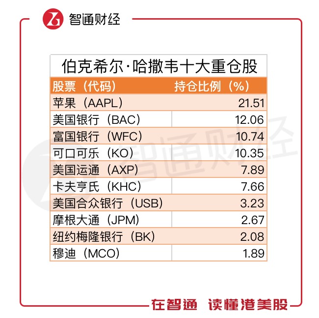 截至12月末,伯克希爾的十大重倉股分別為蘋果、美國銀行、富國銀行、可口可樂、美國運通、卡夫亨氏、美國合眾銀行、摩根大通、紐約梅隆銀行及穆迪。