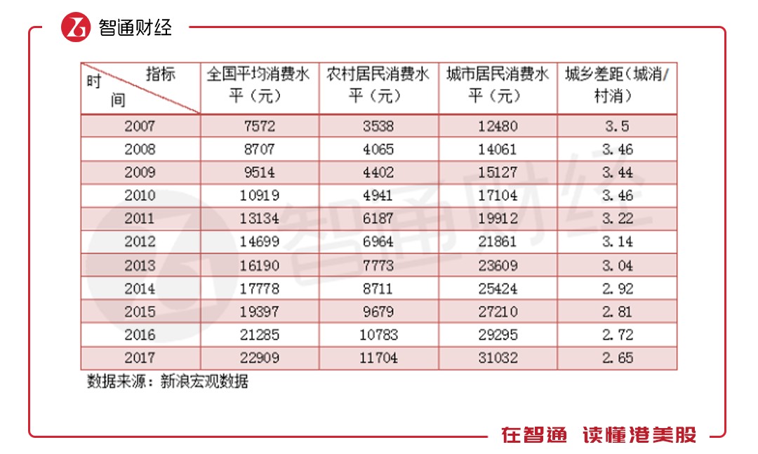 考慮到消費能力的變化,根據(jù)新浪宏觀數(shù)據(jù),2008年農(nóng)村的消費水平為4065元,而城市為14061元,城鄉(xiāng)差距3.46倍,不過城鄉(xiāng)差距慢慢降低了,到2017年為2.65倍,彼時農(nóng)村消費水平為11704元,但仍偏低,相當(dāng)于城市2007年的水平。